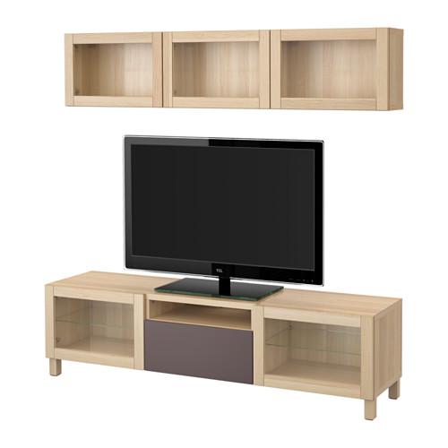 БЕСТО Шкаф для ТВ, комбин/стеклян дверцы - под беленый дуб/Вальвикен темно-коричневый, прозрачное стекло, направляющие ящика,нажимные