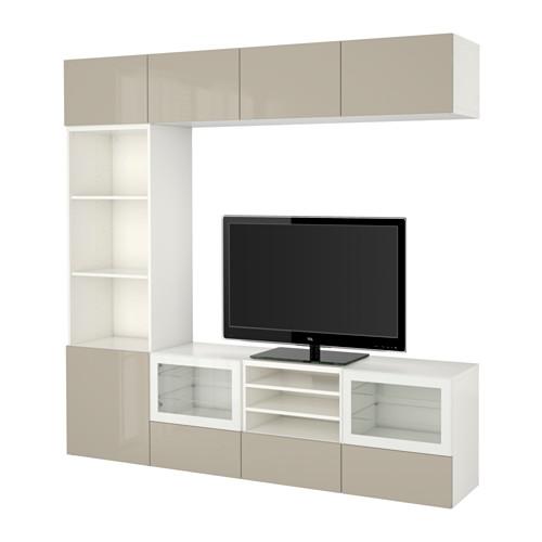 БЕСТО Шкаф для ТВ, комбин/стеклян дверцы - белый/Сельсвикен глянцевый/бежевый прозрачное стекло, направляющие ящика,нажимные