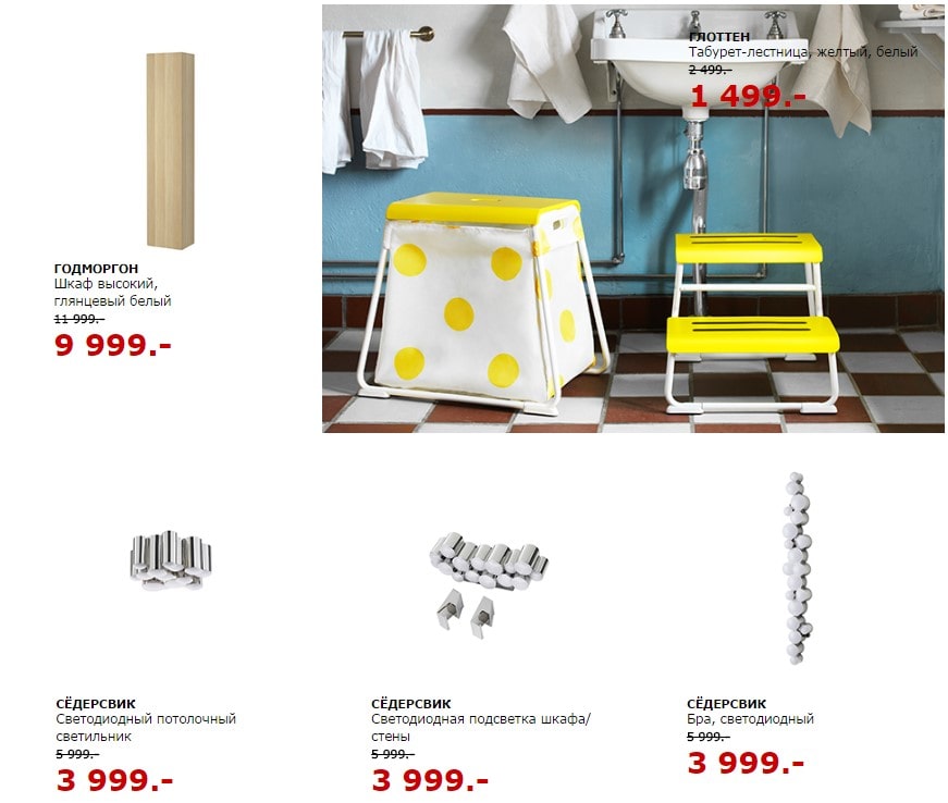 Ассортимент распродажи будет отличаться в зависимости от магазина. Полный перечень товаров на скидке вы можете посмотреть на специальной страничке на сайте ИКЕА - sale.ikea.ru.
