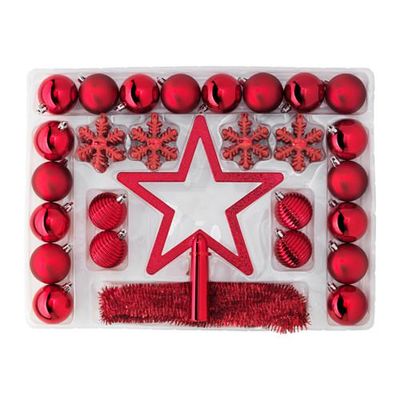 В набор входит: 1 звезда (высота 25 см), 1 гирлянда (длина 2 м), 22 шара и 32 подвесных украшения.
