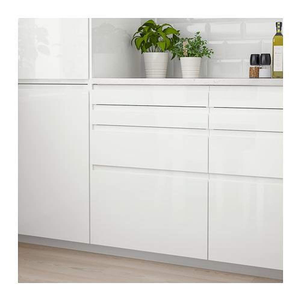Гладкие глянцевые фронтальные панели ящиков ВОКСТОРП с интегрированными ручками придадут открытый современный облик интерьеру кухни.