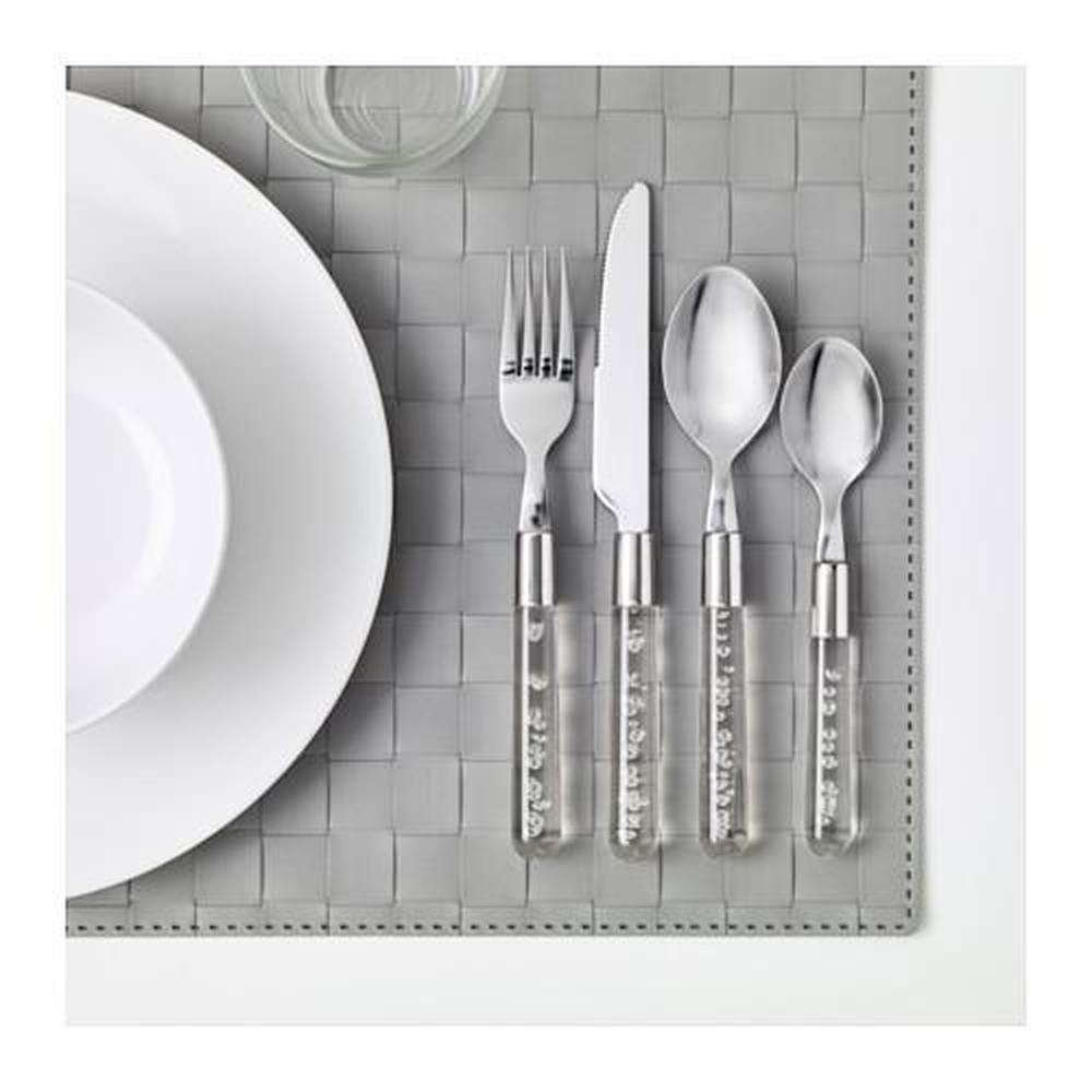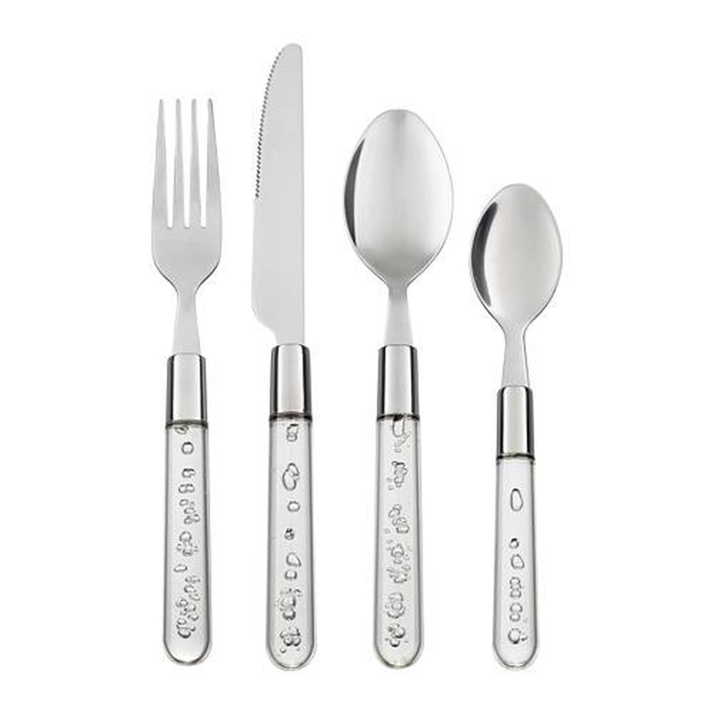 В комплект входят: 6 вилок, 6 ножей, 6 ложек и 6 чайных ложек.