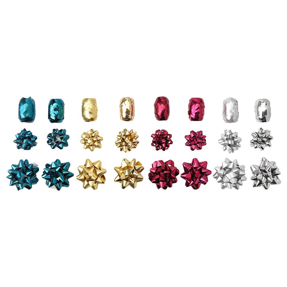 В набор входит: 8 бантов (диам. 9 см), 8 бантов (диам. 6 см) и 8 лент (5 мм x 20 м).
