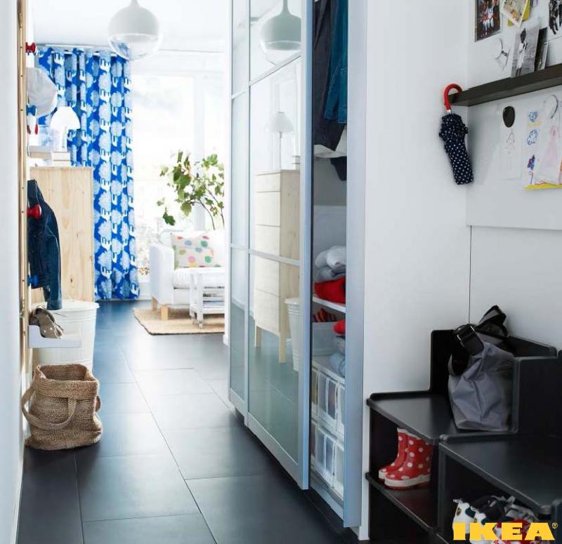 В этом интерьере прихожей коридора используются: ПАКС ЛЮГДАЛЬ гардероб с внутренним оснащением 799.187.81, СКУББ коробки для обуви (на нижних полках гардероба) 302.518.36, РИББА полка для картин (на стене справа) 301.525.96, ИКЕА ПС 2012 скамья с полкой для обуви (справа от гардероба) 802.067.47, ВЭСТЕР светодиодный светильник 701.914.78, ИКЕА ПС 2012 вешалка (на стене слева) 902.065.39.