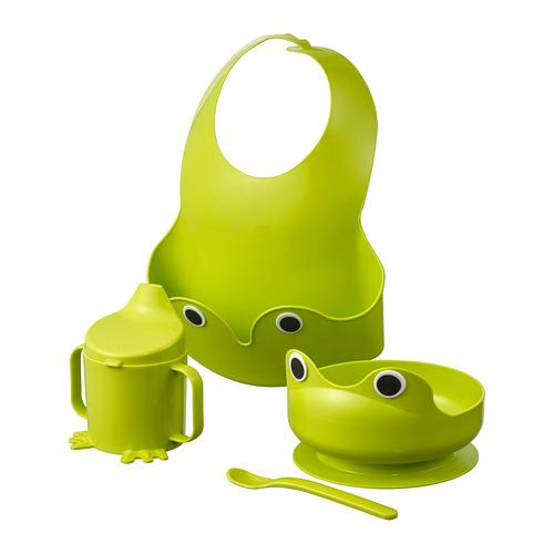 В этом забавном «лягушачьем» комплекте есть все необходимое для того, чтобы ваш малыш учился есть и пить самостоятельно. А нагрудник защитит детскую одежду от разных случайностей.