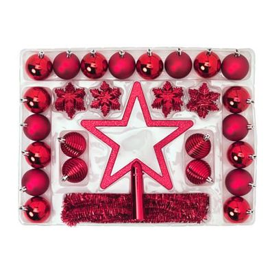В набор входит: 1 звезда (высота 25 см), 1 гирлянда (длина 5 м), 22 шара и 32 подвесных украшения.