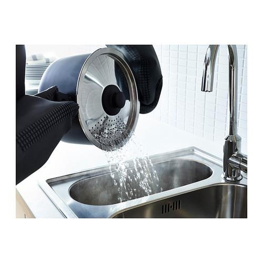 Крышка 5-литровой кастрюли оснащена специальной задвижкой. Это позволяет легко слить воду из кастрюли через отверстия в крышке.