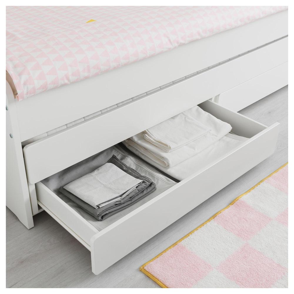 Данная модель встраивается в каркас кровати СЛЭКТ, который продается отдельно. Выдвижная кровать – отличное решение, когда друг остается ночевать в гостях у вашего ребенка. А для хранения постельного белья и игрушек есть два вместительных ящика.