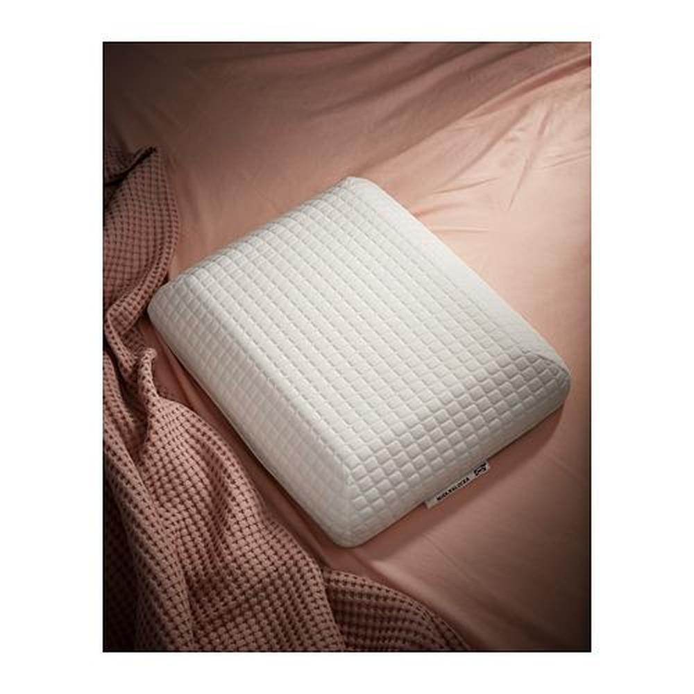 Универсальная эргономичная подушка МЬЁЛККЛОККА подходит для сна на боку или спине: мягкий пенополиуретан с эффектом памяти прекрасно адаптируется, даже если человек ворочается во сне.
