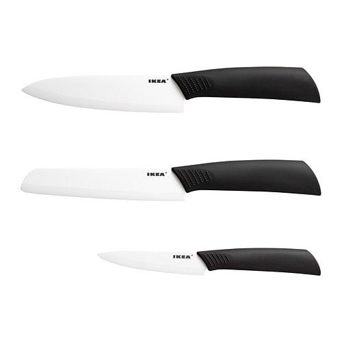 В набор входит: нож для овощей 10 см (общ. длина 22 см), нож для овощей 16 см (общ. длина 26 см) и поварской нож 16 см (общ. длина 26 см).