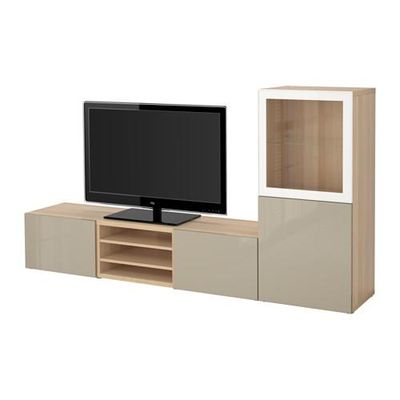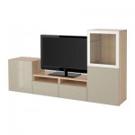 БЕСТО Шкаф для ТВ, комбин/стеклян дверцы - под беленый дуб/Сельсвикен глянцевый/бежевый прозрачное стекло, направляющие ящика, плавно закр