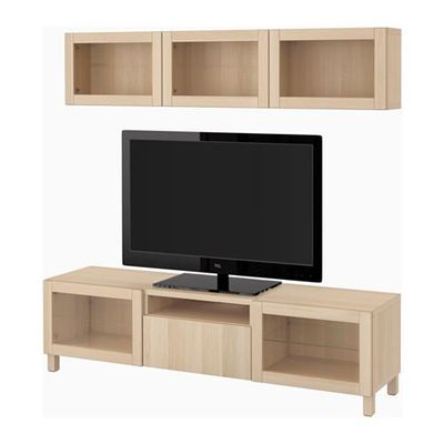 БЕСТО Шкаф для ТВ, комбин/стеклян дверцы - Лаппвикен/Синдвик под беленый дуб, прозрачное стелко, направляющие ящика, плавно закр