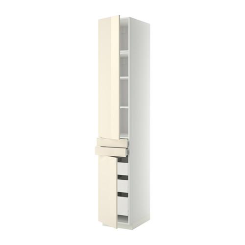 МЕТОД / МАКСИМЕРА Высок шкаф+полки/5ящк/2дверцы/2фрнт - 40x60x240 см, Рингульт глянцевый кремовый, белый