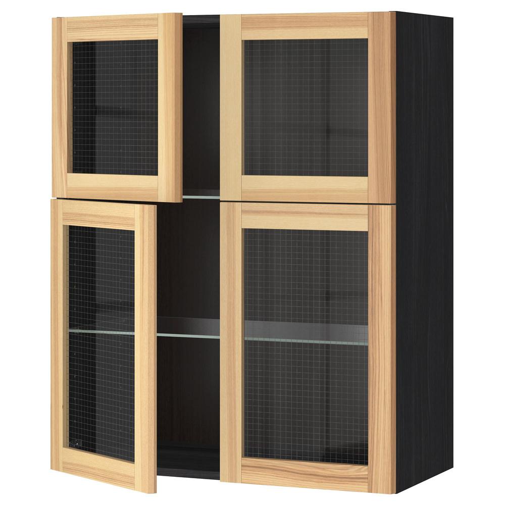 МЕТОД Навесной шкаф с полками/4 стекл дв - под дерево черный, Торхэмн естественный ясень