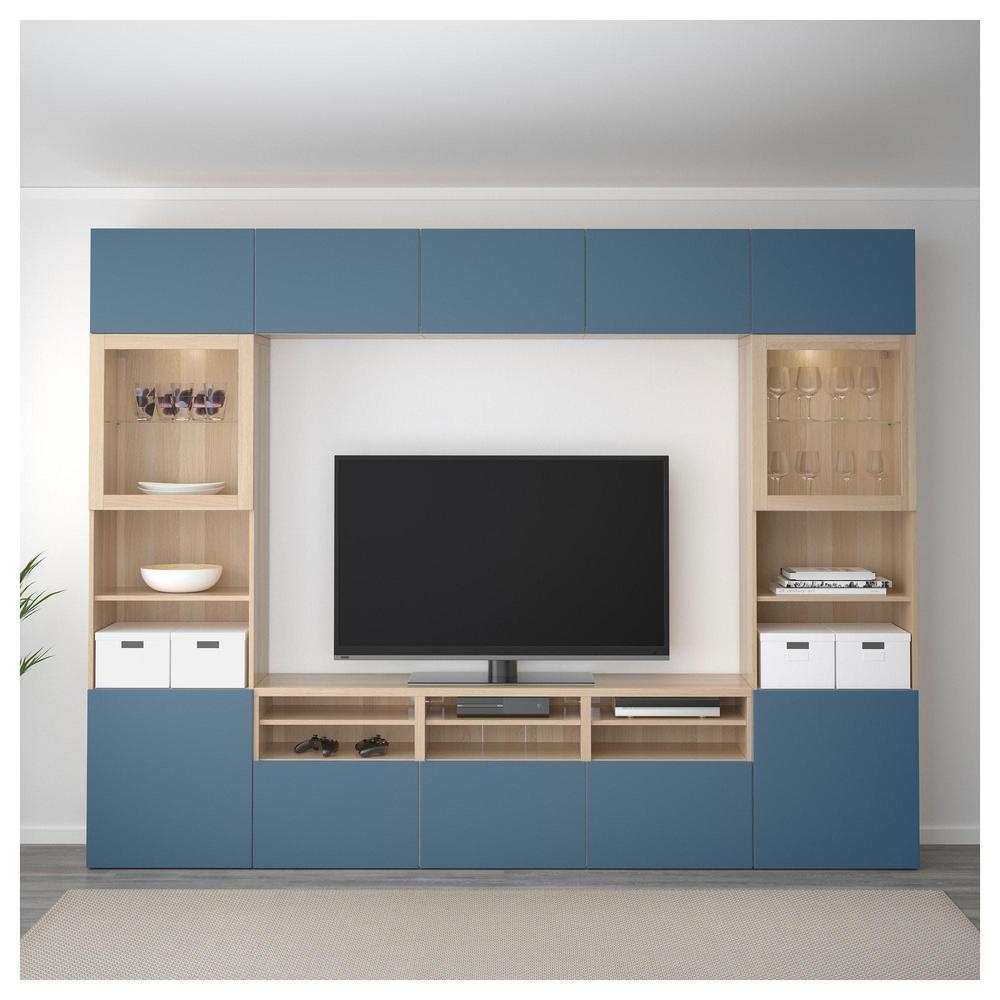 БЕСТО Шкаф для ТВ, комбин/стеклян дверцы - под беленый дуб Вальвикен/темно-синий прозрачное стекло, направляющие ящика, плавно закр