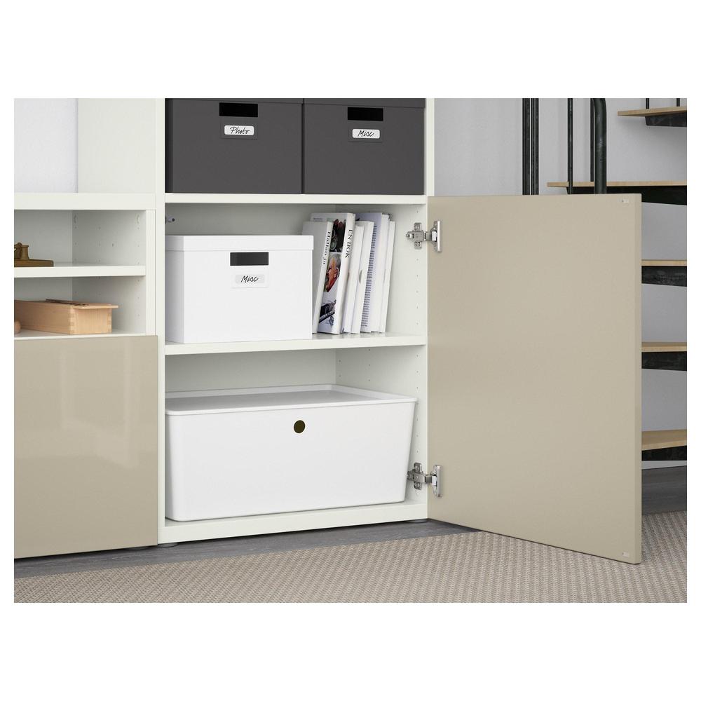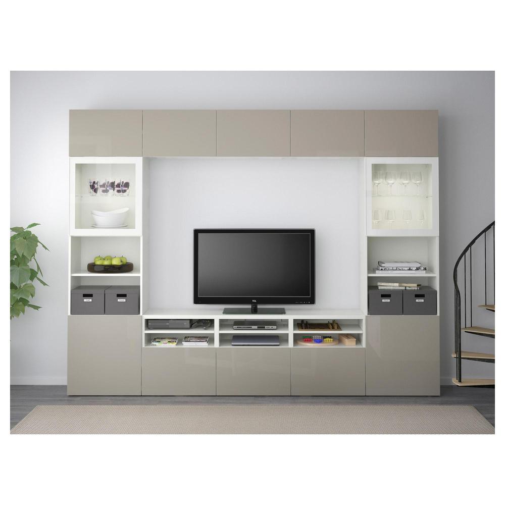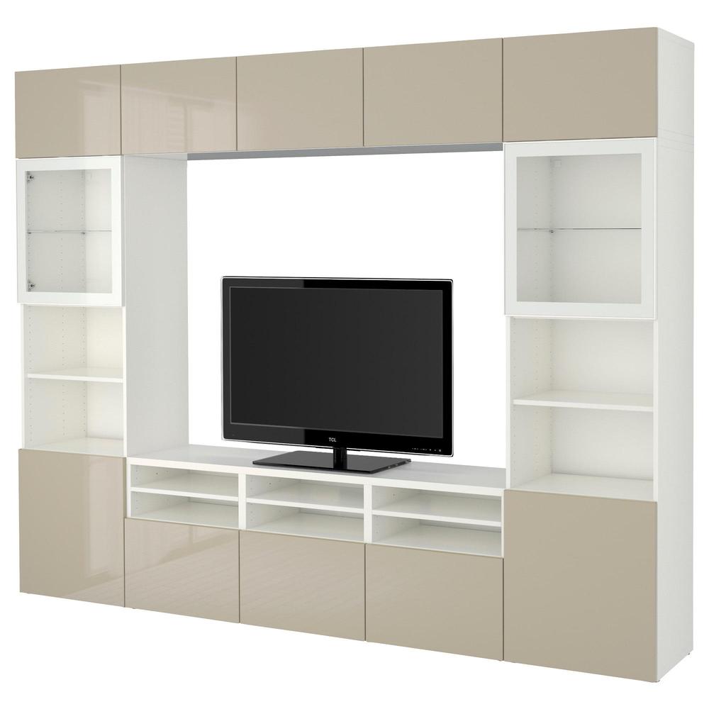 БЕСТО Шкаф для ТВ, комбин/стеклян дверцы - белый/Сельсвикен глянцевый/бежевый прозрачное стекло, направляющие ящика,нажимные