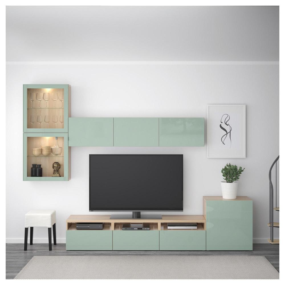 БЕСТО Шкаф для ТВ, комбин/стеклян дверцы - под беленый дуб Сельсвикен/глянцевый/серо-зеленый светлый прозрачное стекло, направляющие ящика, плавно закр