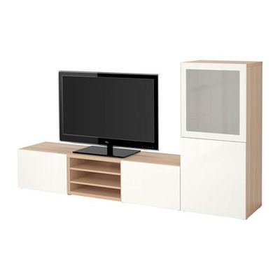БЕСТО Шкаф для ТВ, комбин/стеклян дверцы - под беленый дуб/Сельсвикен глянцевый/белый матовое стекло, направляющие ящика, плавно закр