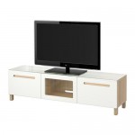 БЕСТО Тумба под ТВ, с дверцами - под беленый дуб/Сельсвикен глянцевый/белый прозрачное стекло, направляющие ящика, плавно закр