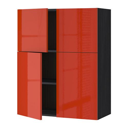 МЕТОД Навесной шкаф с полками/4дверцы - под дерево черный, Ерста глянцевый оранжевый