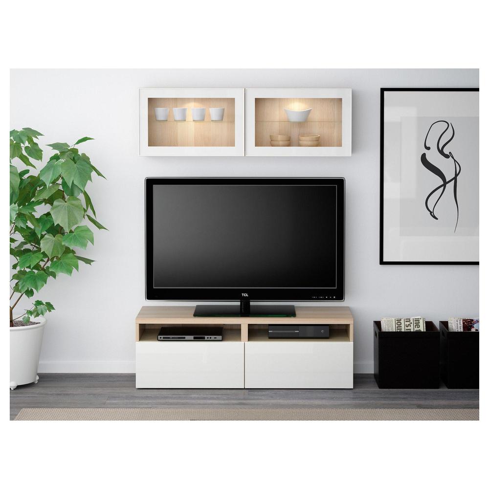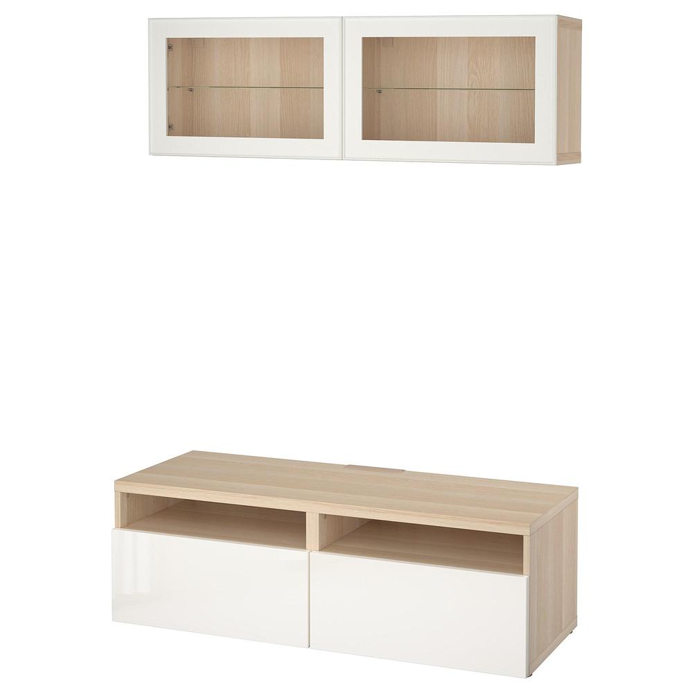 БЕСТО Шкаф для ТВ, комбин/стеклян дверцы - под беленый дуб/Сельсвикен глянцевый/белый прозрачное стекло, направляющие ящика, плавно закр
