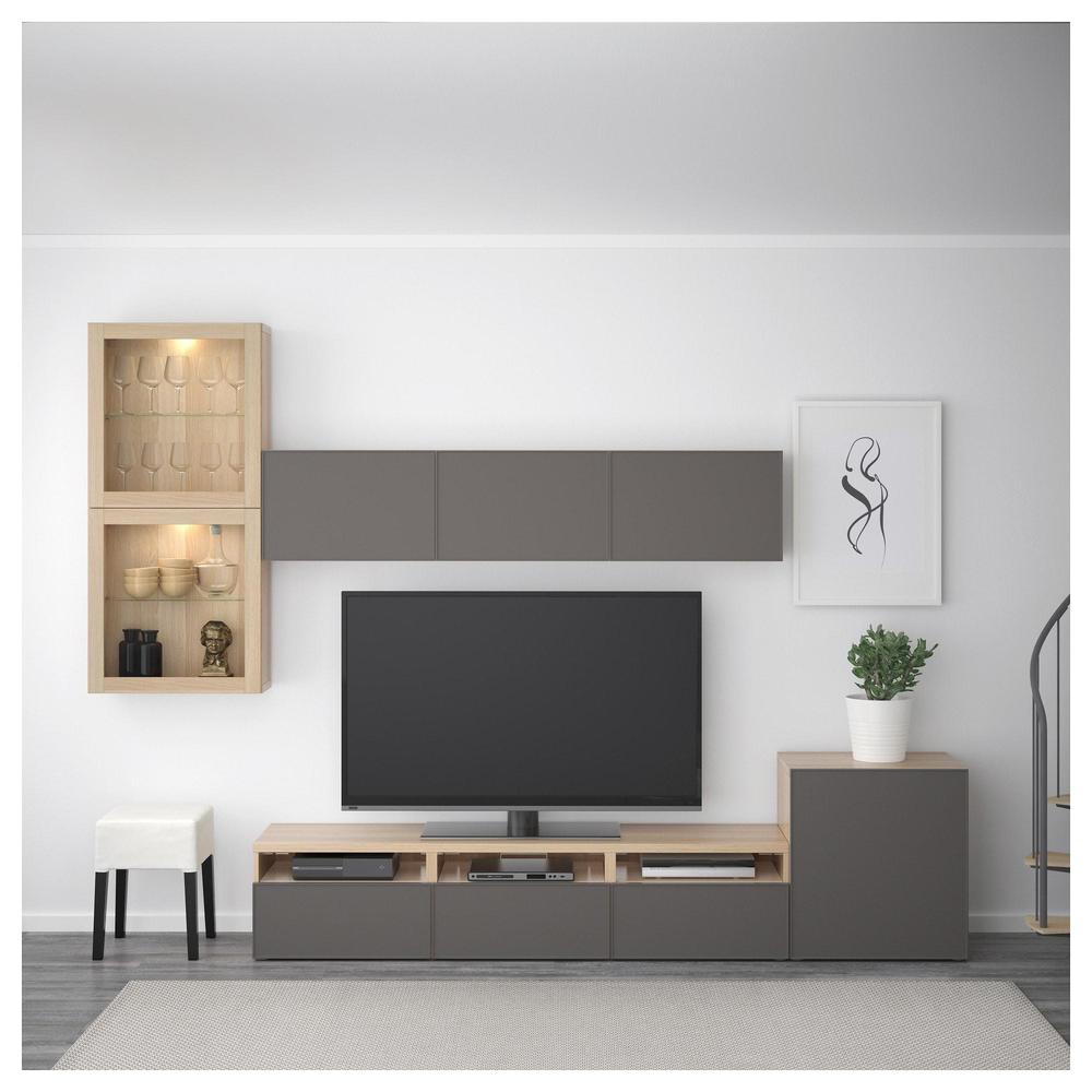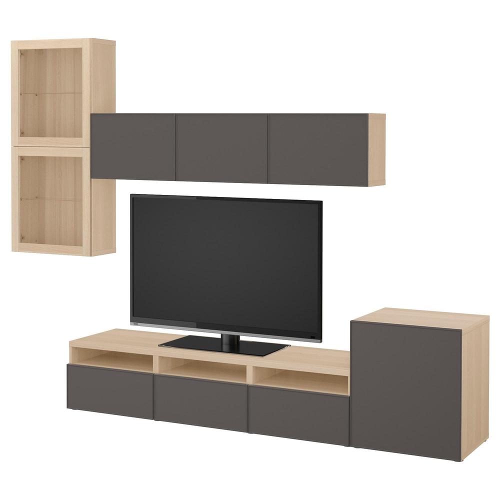 БЕСТО Шкаф для ТВ, комбин/стеклян дверцы - под беленый дуб Грундсвикен/темно-серый прозрачное стекло, направляющие ящика,нажимные