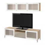 БЕСТО Шкаф для ТВ, комбин/стеклян дверцы - под беленый дуб/Сельсвикен глянцевый/бежевый матовое стекло, направляющие ящика,нажимные