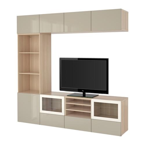 БЕСТО Шкаф для ТВ, комбин/стеклян дверцы - под беленый дуб/Сельсвикен глянцевый/бежевый прозрачное стекло, направляющие ящика,нажимные