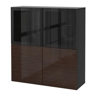 БЕСТО Комбинация д/хранения+стекл дверц - черно-коричневый/Сельсвикен глянцевый/коричневый прозрач стекло, направляющие ящика, плавно закр