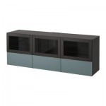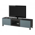 БЕСТО Тумба под ТВ, с дверцами - черно-коричневый/Вальвикен серо-бирюзовый, прозрачное стекло, направляющие ящика, плавно закр