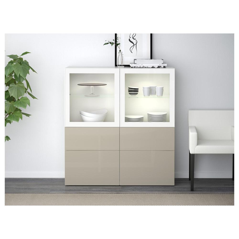 БЕСТО Комбинация д/хранения+стекл дверц - белый/Сельсвикен глянцевый/бежевый прозрачное стекло, направляющие ящика,нажимные