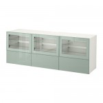 БЕСТО Тумба под ТВ, с дверцами и ящиками - белый Сельсвикен/глянцевый/серо-зеленый светлый прозрачное стекло, направляющие ящика,нажимные