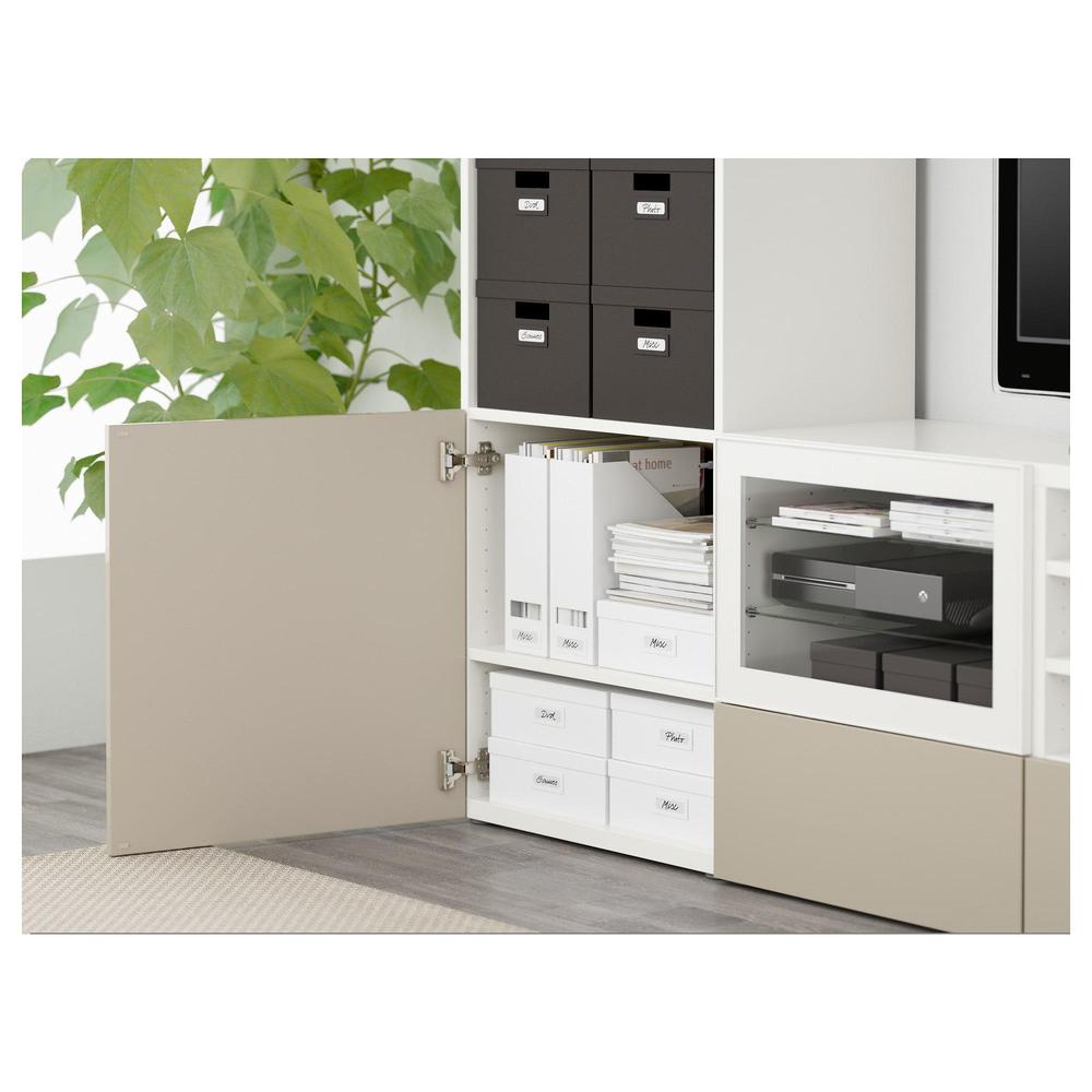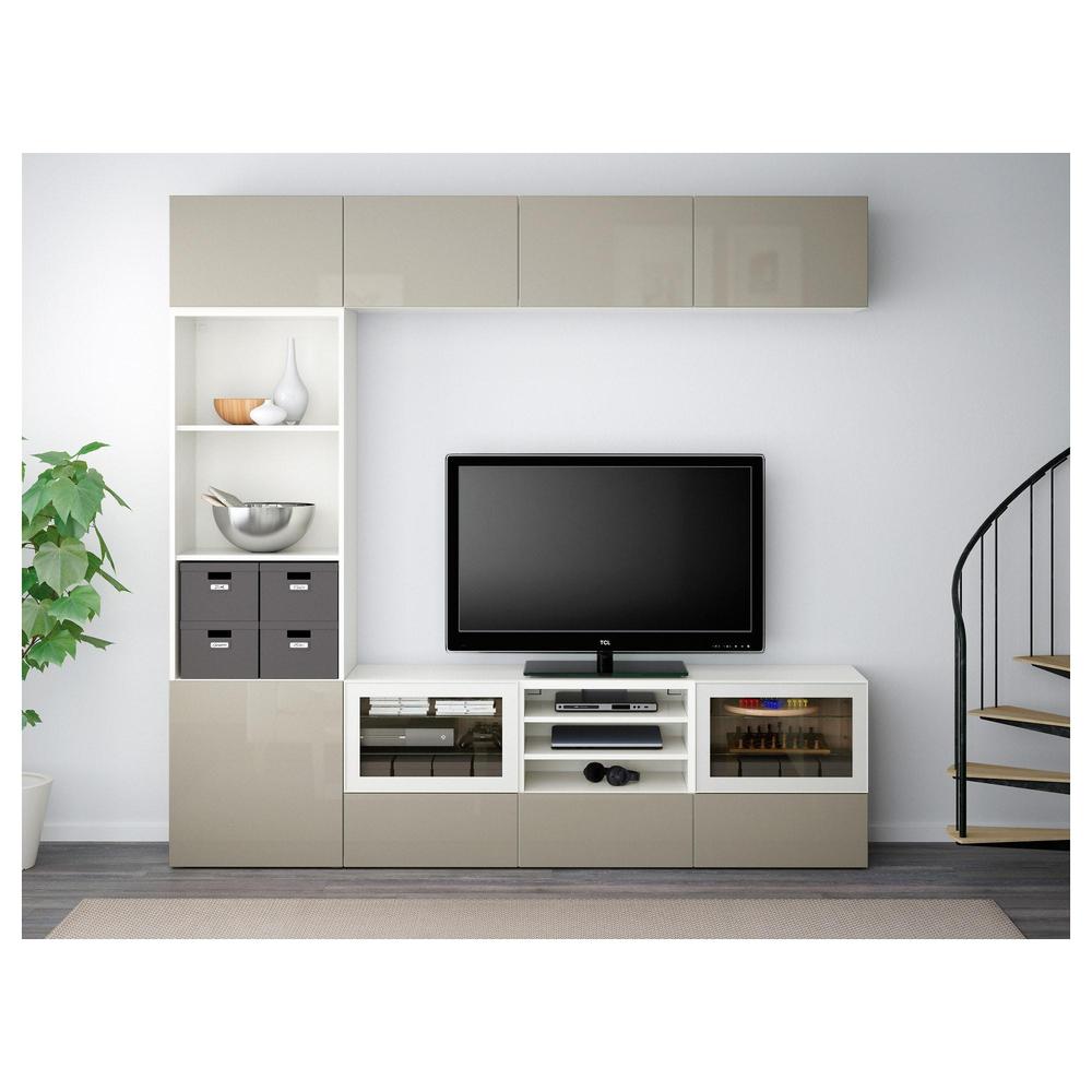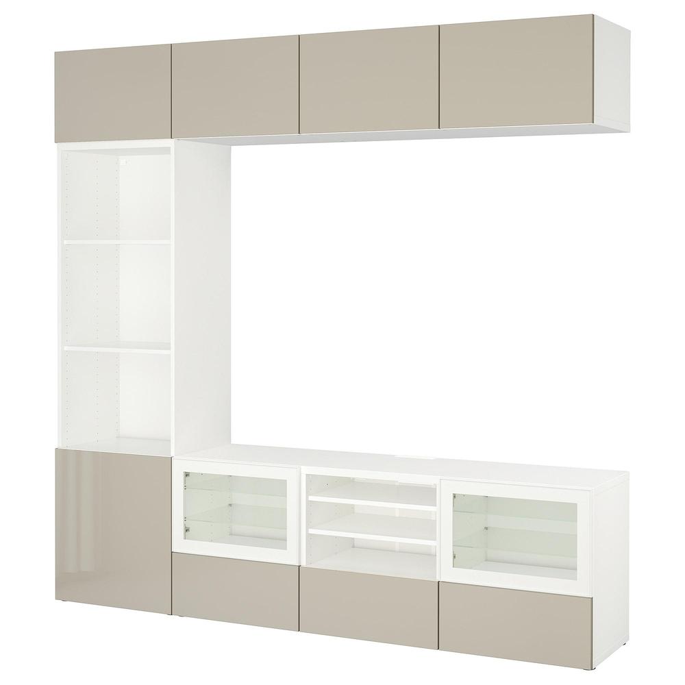 БЕСТО Шкаф для ТВ, комбин/стеклян дверцы - белый/Сельсвикен глянцевый/бежевый прозрачное стекло, направляющие ящика, плавно закр