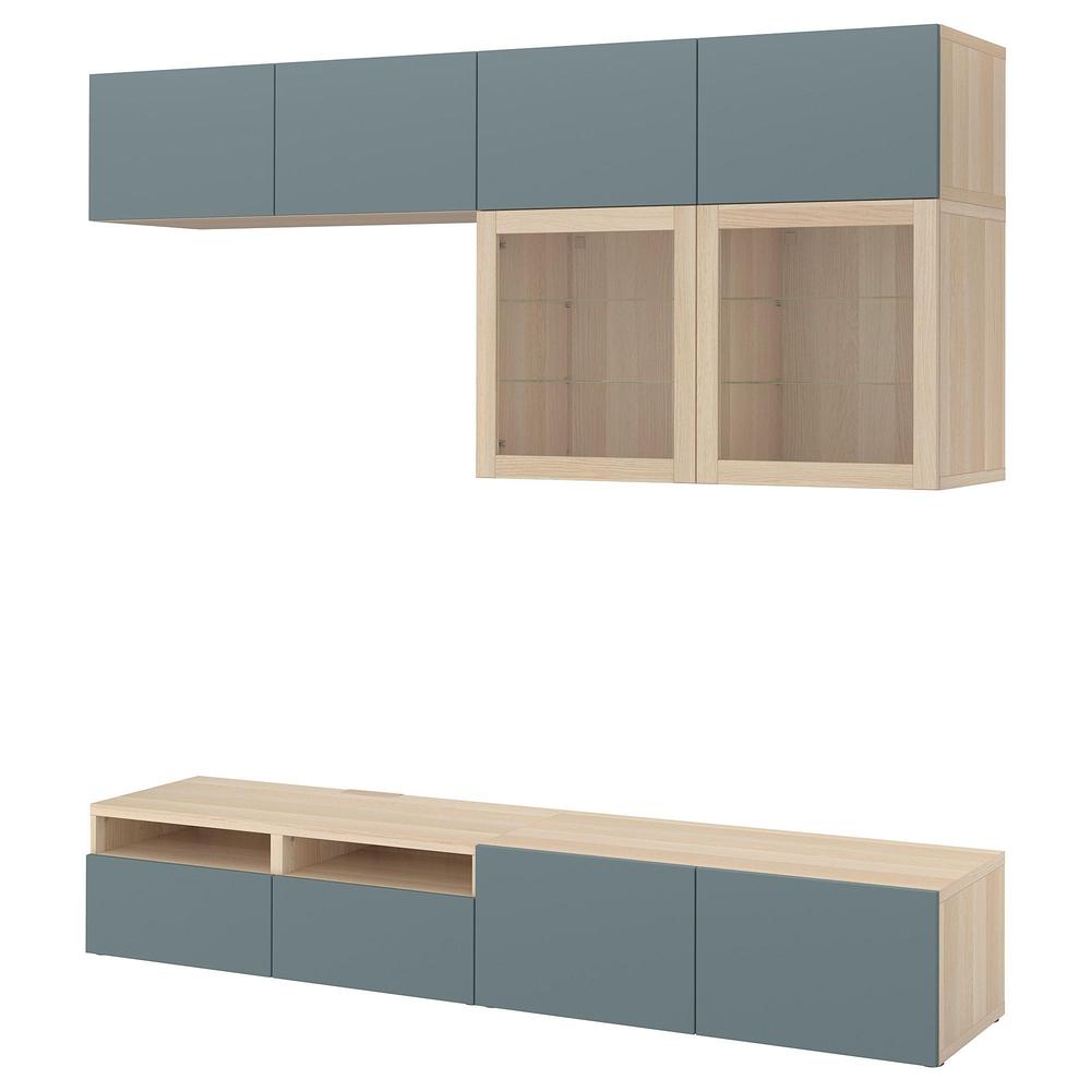 БЕСТО Шкаф для ТВ, комбин/стеклян дверцы - под беленый дуб/Вальвикен серо-бирюзовый, прозрачное стекло, направляющие ящика, плавно закр
