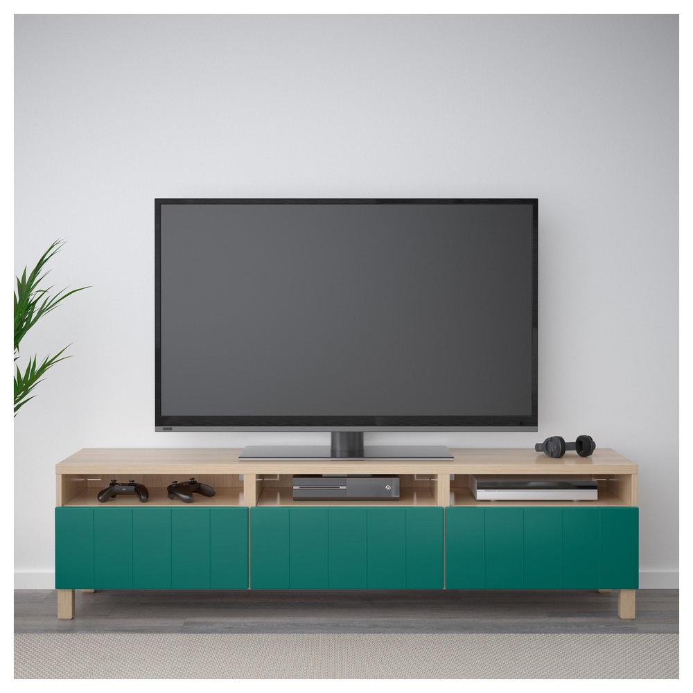 БЕСТО Тумба д/ТВ с ящиками - под беленый дуб/Халлставик сине-зеленый, направляющие ящика,нажимные