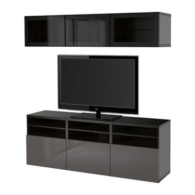 БЕСТО Шкаф для ТВ, комбин/стеклян дверцы - черно-коричневый/Сельсвикен глянцевый/серый прозрачное стекло, направляющие ящика, плавно закр