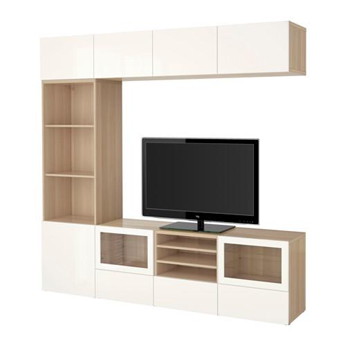 БЕСТО Шкаф для ТВ, комбин/стеклян дверцы - под беленый дуб/Сельсвикен глянцевый/белый прозрачное стекло, направляющие ящика, плавно закр