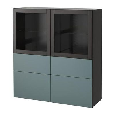 БЕСТО Комбинация д/хранения+стекл дверц - черно-коричневый/Вальвикен серо-бирюзовый, прозрачное стекло, направляющие ящика,нажимные