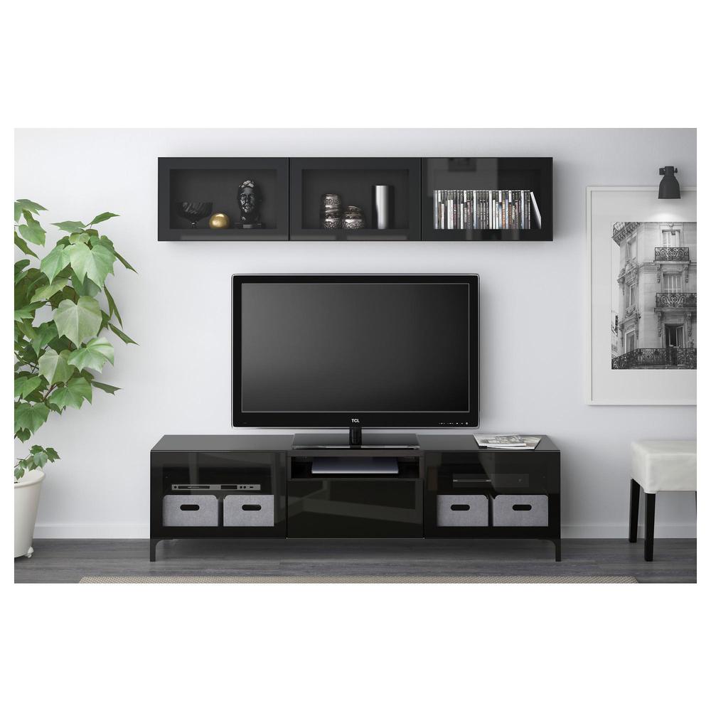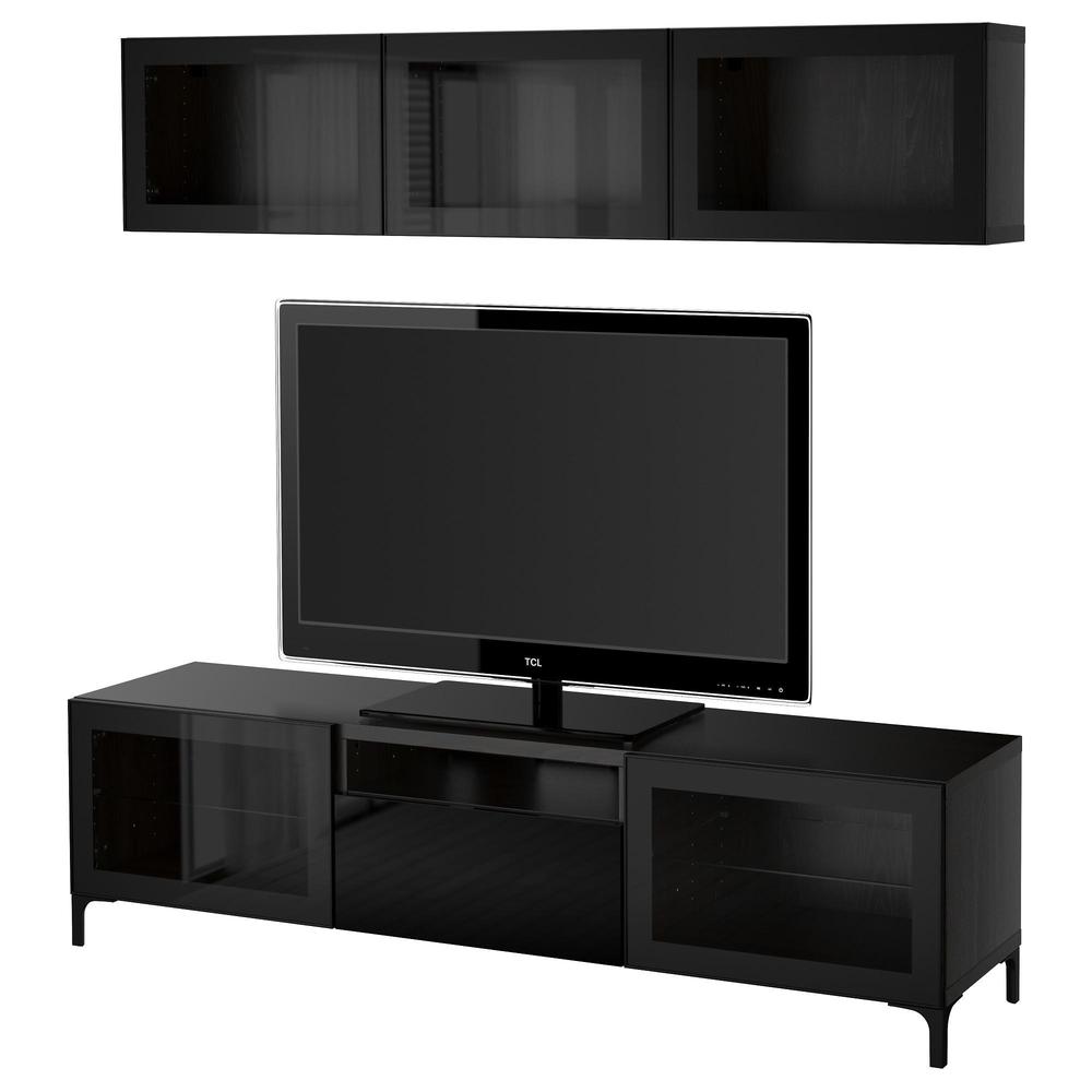 БЕСТО Шкаф для ТВ, комбин/стеклян дверцы - черно-коричневый/Сельсвикен глянцевый/черный прозрачное стекло, направляющие ящика,нажимные
