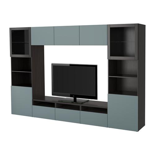 БЕСТО Шкаф для ТВ, комбин/стеклян дверцы - черно-коричневый/Вальвикен серо-бирюзовый, прозрачное стекло, направляющие ящика, плавно закр