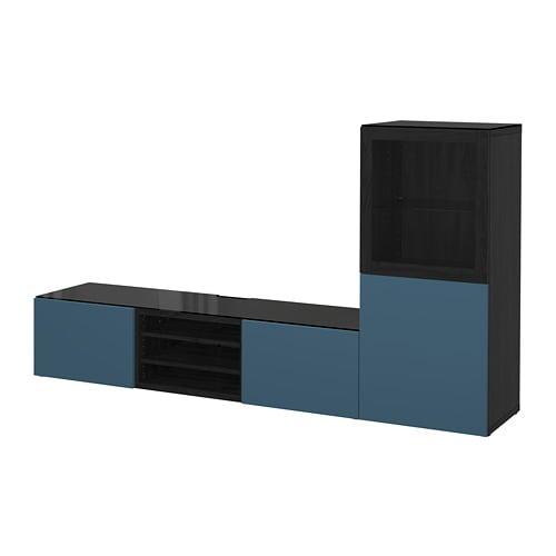 БЕСТО Шкаф для ТВ, комбин/стеклян дверцы - черно-коричневый Вальвикен/темно-синий прозрачное стекло, направляющие ящика,нажимные