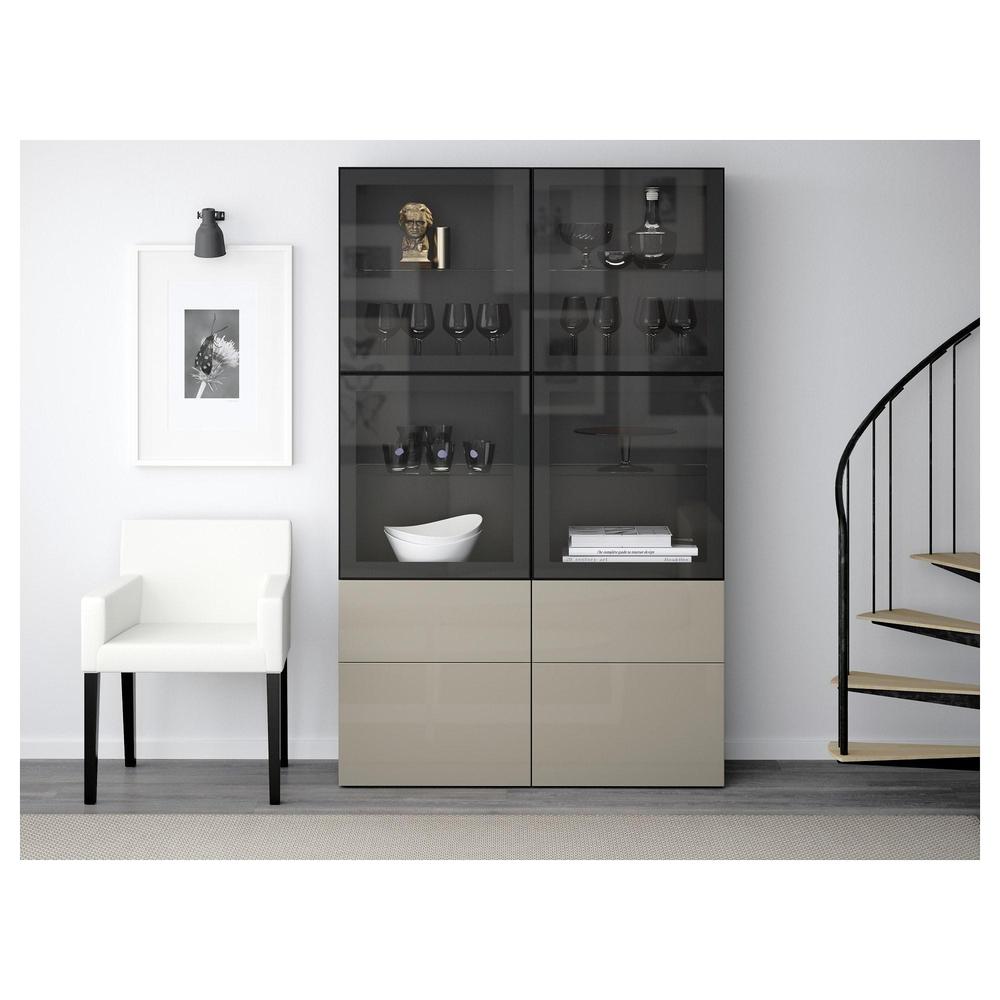 БЕСТО Комбинация д/хранения+стекл дверц - черно-коричневый/Сельсвикен глянцевый/бежевый прозрачное стекло, направляющие ящика, плавно закр