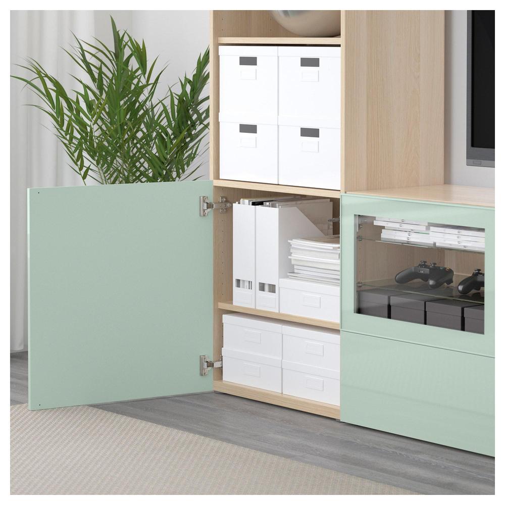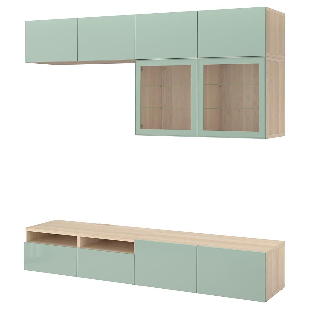 БЕСТО Шкаф для ТВ, комбин/стеклян дверцы - под беленый дуб Сельсвикен/глянцевый/серо-зеленый светлый прозрачное стекло, направляющие ящика, плавно закр