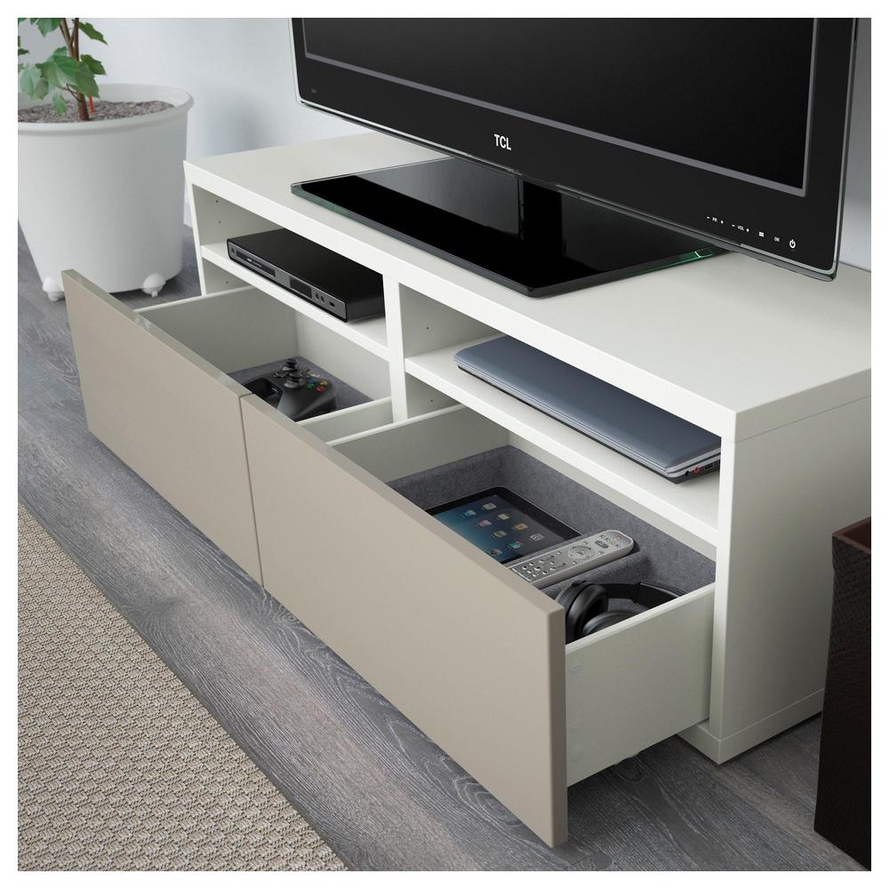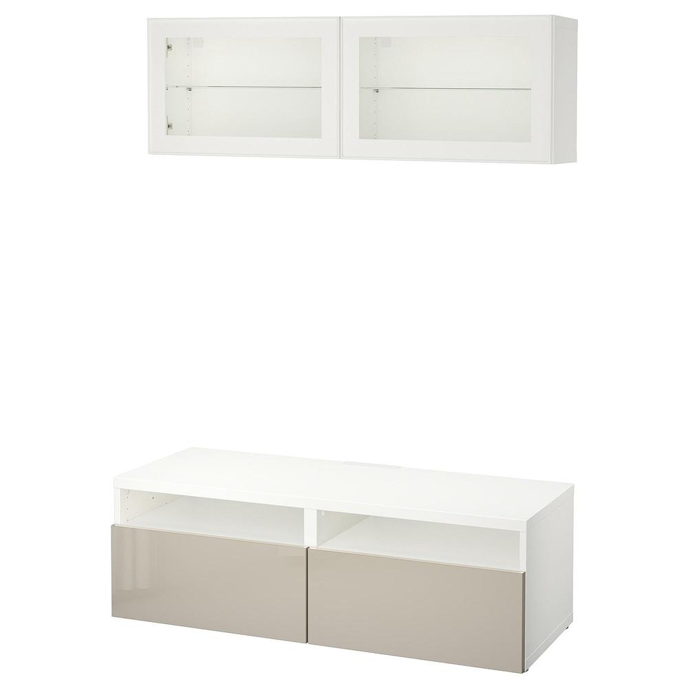БЕСТО Шкаф для ТВ, комбин/стеклян дверцы - белый/Сельсвикен глянцевый/бежевый прозрачное стекло, направляющие ящика, плавно закр
