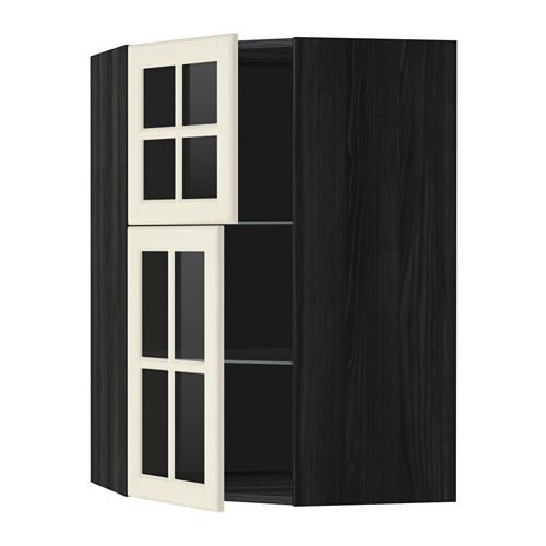 МЕТОД Углов навесной шкаф+полки/2 сткл дв - под дерево черный, Будбин белый с оттенком
