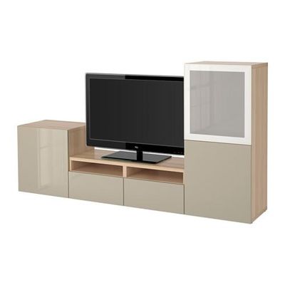 БЕСТО Шкаф для ТВ, комбин/стеклян дверцы - под беленый дуб/Сельсвикен глянцевый/бежевый матовое стекло, направляющие ящика,нажимные