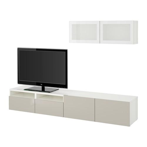 БЕСТО Шкаф для ТВ, комбин/стеклян дверцы - белый/Сельсвикен глянцевый/бежевый матовое стекло, направляющие ящика,нажимные