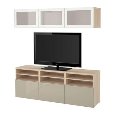 БЕСТО Шкаф для ТВ, комбин/стеклян дверцы - под беленый дуб/Сельсвикен глянцевый/бежевый матовое стекло, направляющие ящика, плавно закр