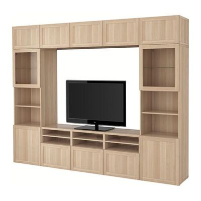 БЕСТО Шкаф для ТВ, комбин/стеклян дверцы - Ханвикен/Синдвик под беленый дуб, прозрачное стелко, направляющие ящика,нажимные