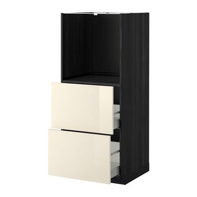 МЕТОД / МАКСИМЕРА Высокий шкаф с 2 ящиками д/духовки - Рингульт глянцевый кремовый, под дерево черный